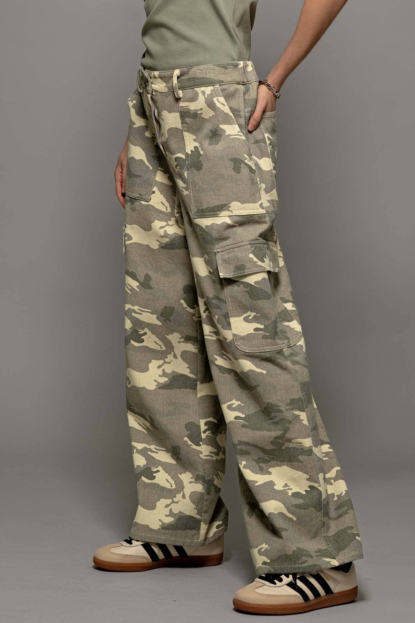 Relaxed fit cargo pants featuring a classic desert camo print. The wide-leg silhouette and utility pockets create a modern casual piece perfect for everyday wear.