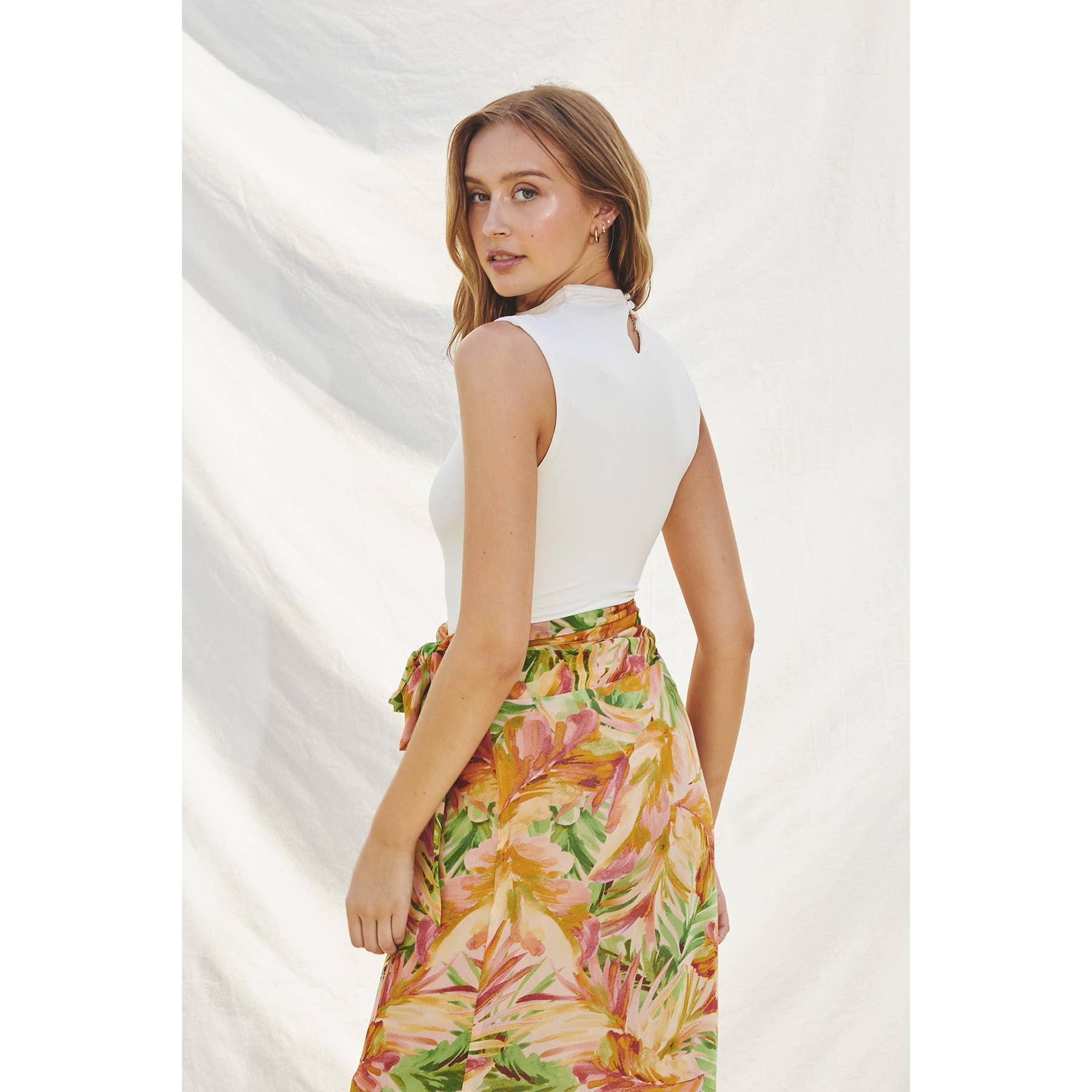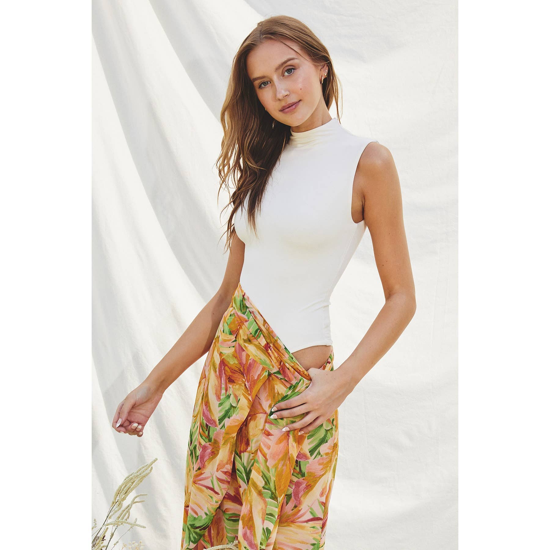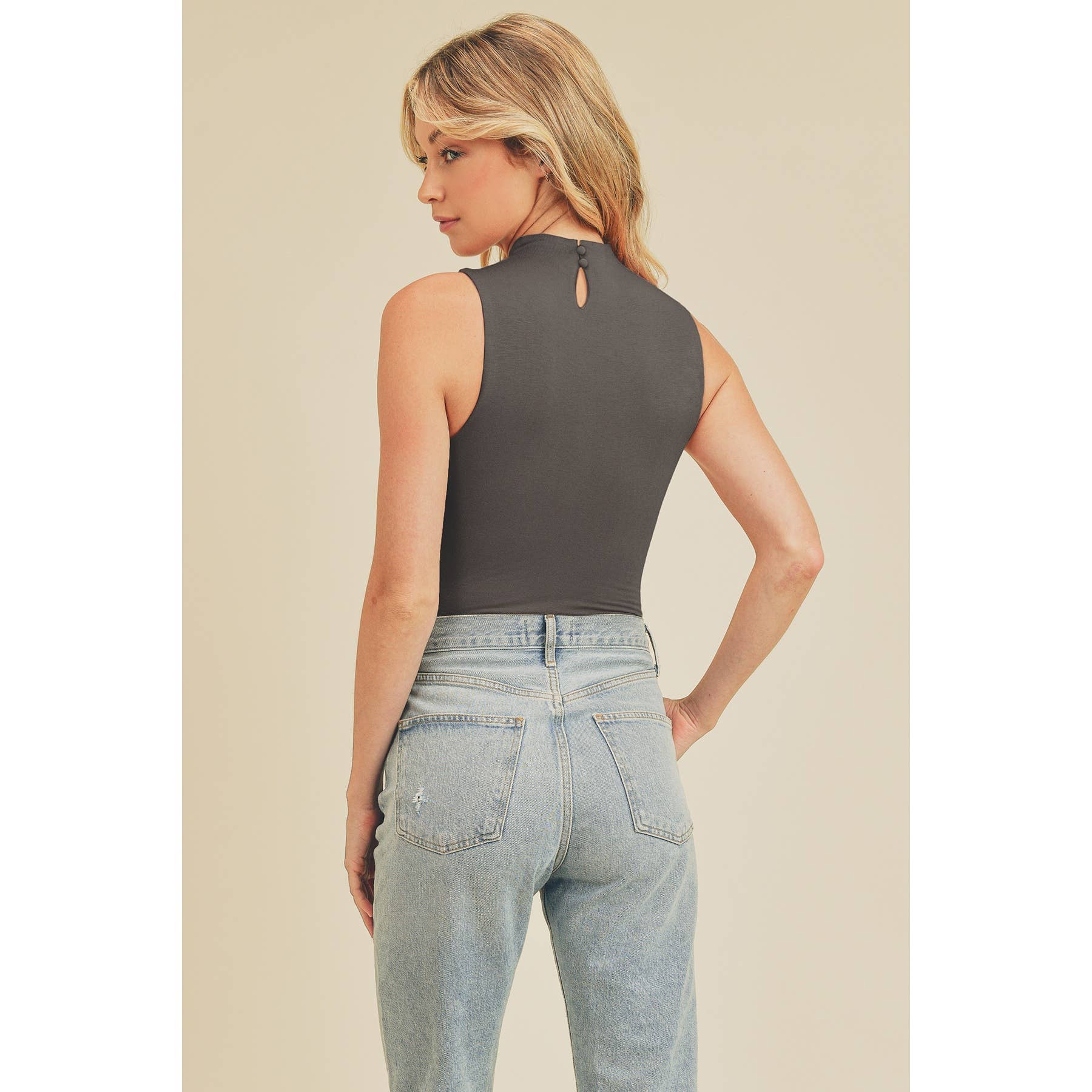 This is a mock neck sleeveless bodysuit with button closures and a keyhole on the back and a thong bottom with snap button closures at the crotch.