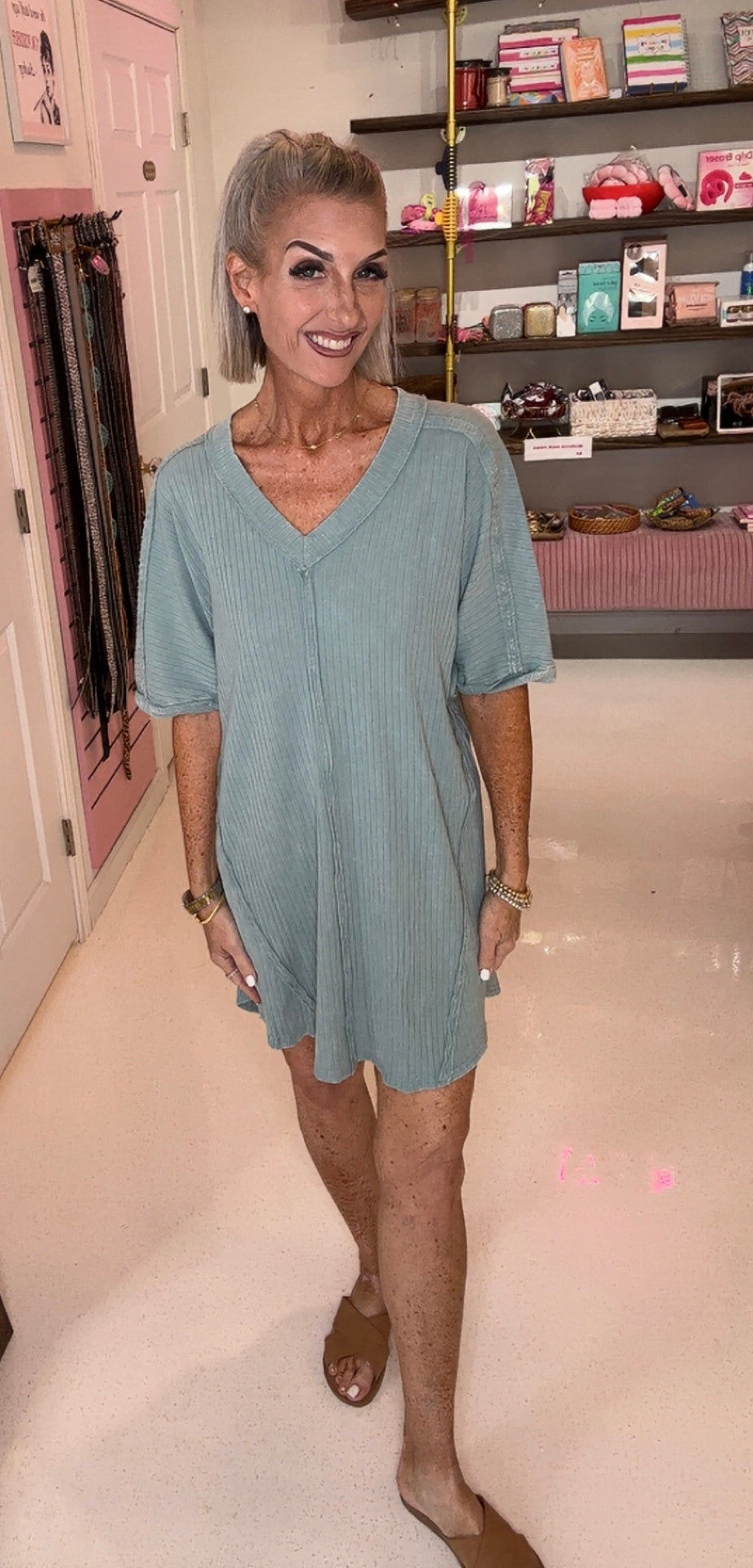 Mineral Washed Ribbed Knit Shift Mini Dress - V-Neck - Oversized - Drop Shoulder - Short Sleeve - Round Hi-lo Hem (Model height: 5"8", wearing a Small, 2-2-2 Size Ratio, NEW IN)