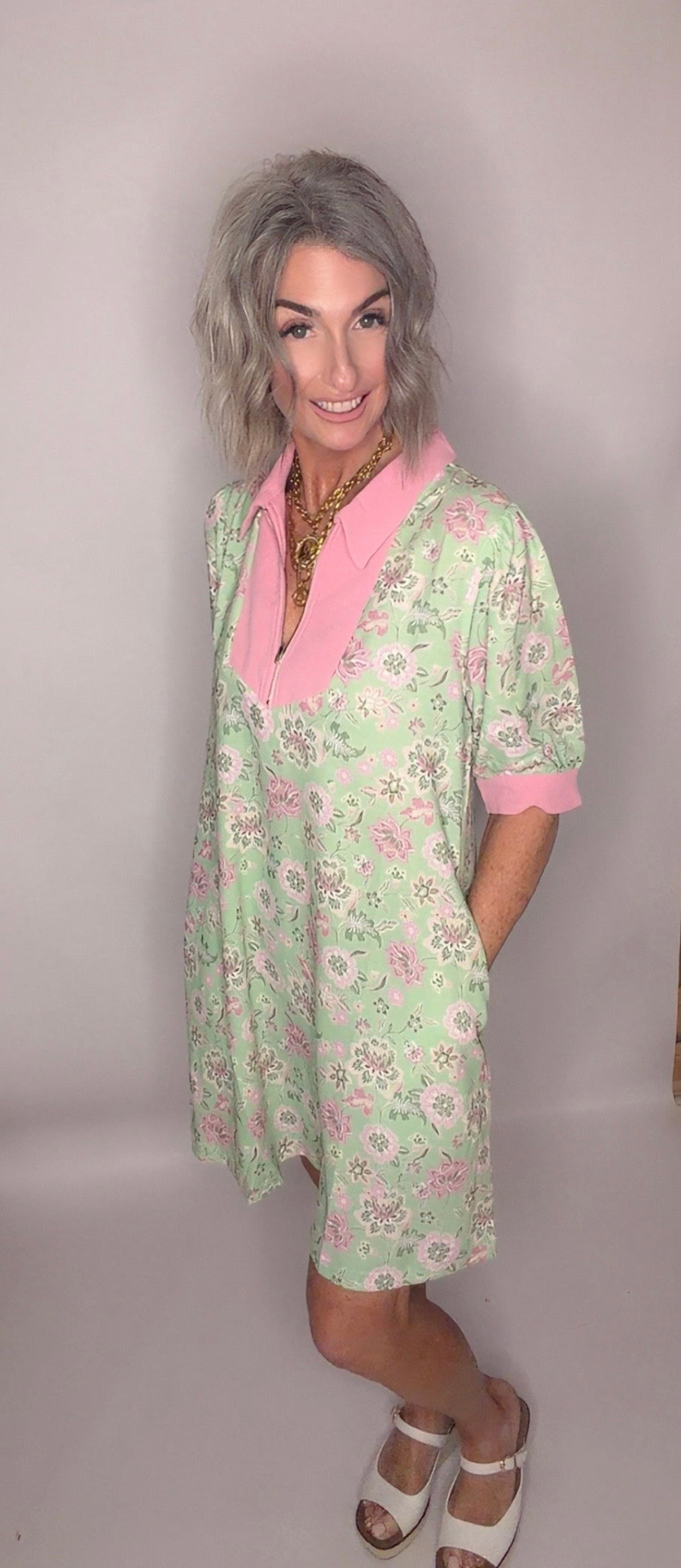 PRINTED WOVEN MINI DRESS WITH CONTRAST COLLAR, CHEST COLLAR, AND FRONT ZIPPER