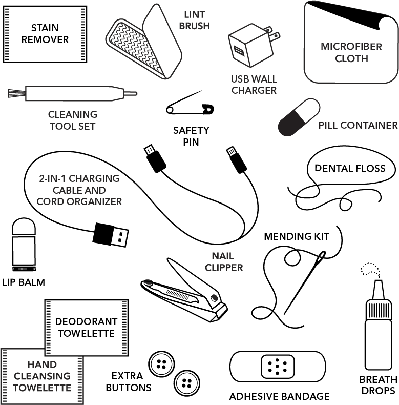 The kit includes: microfiber cloth, adhesive bandage, nail clipper, dental floss, lint brush, extra buttons, wall plug, earbud cleaning tool, pill box, cord organizer, breath drops, lip balm, mending kit, safety pin, deodorant wipe, stain remover wipe, and hand cleansing wipe.