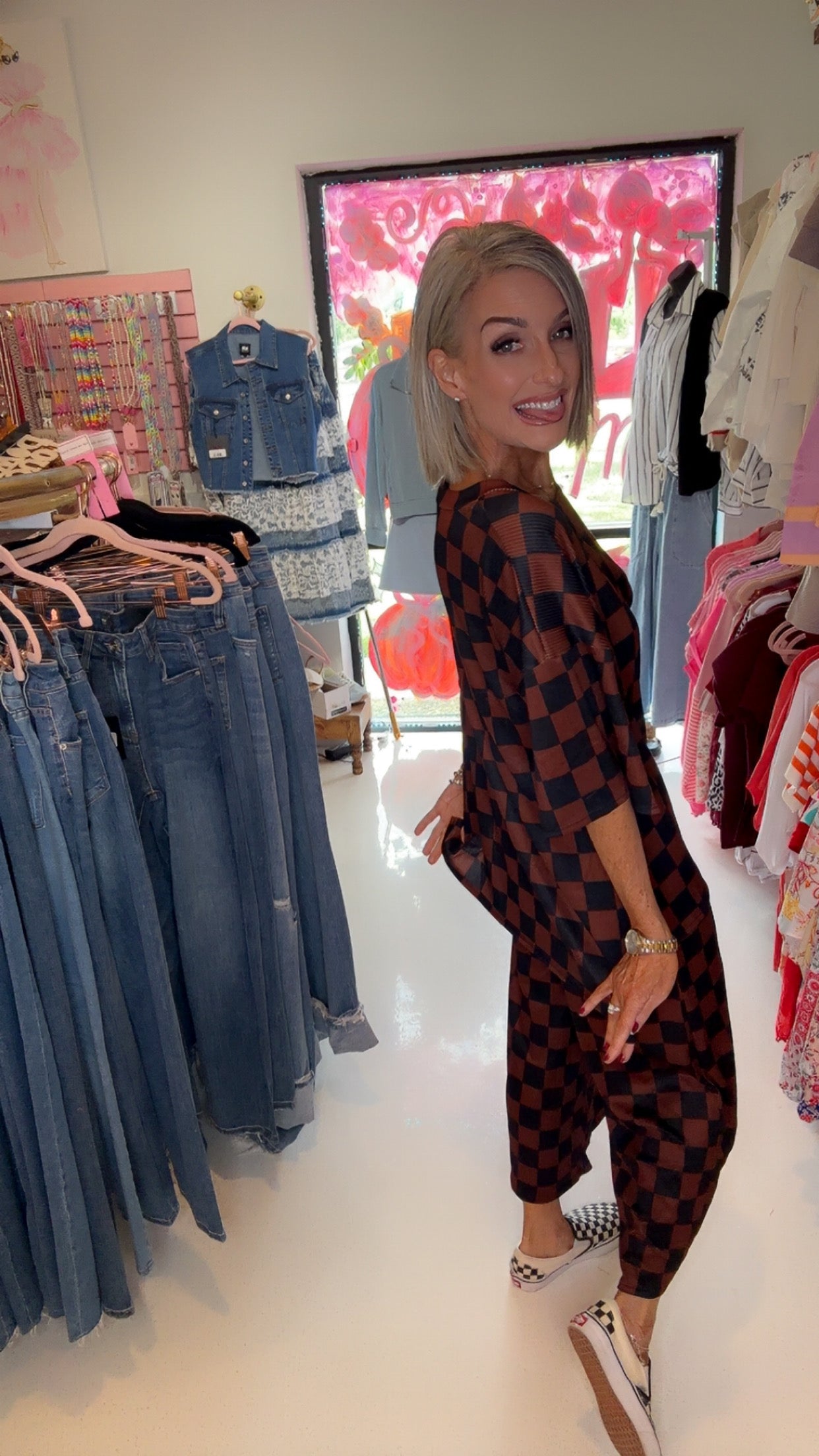 Ribbed checkered print top/ pant set