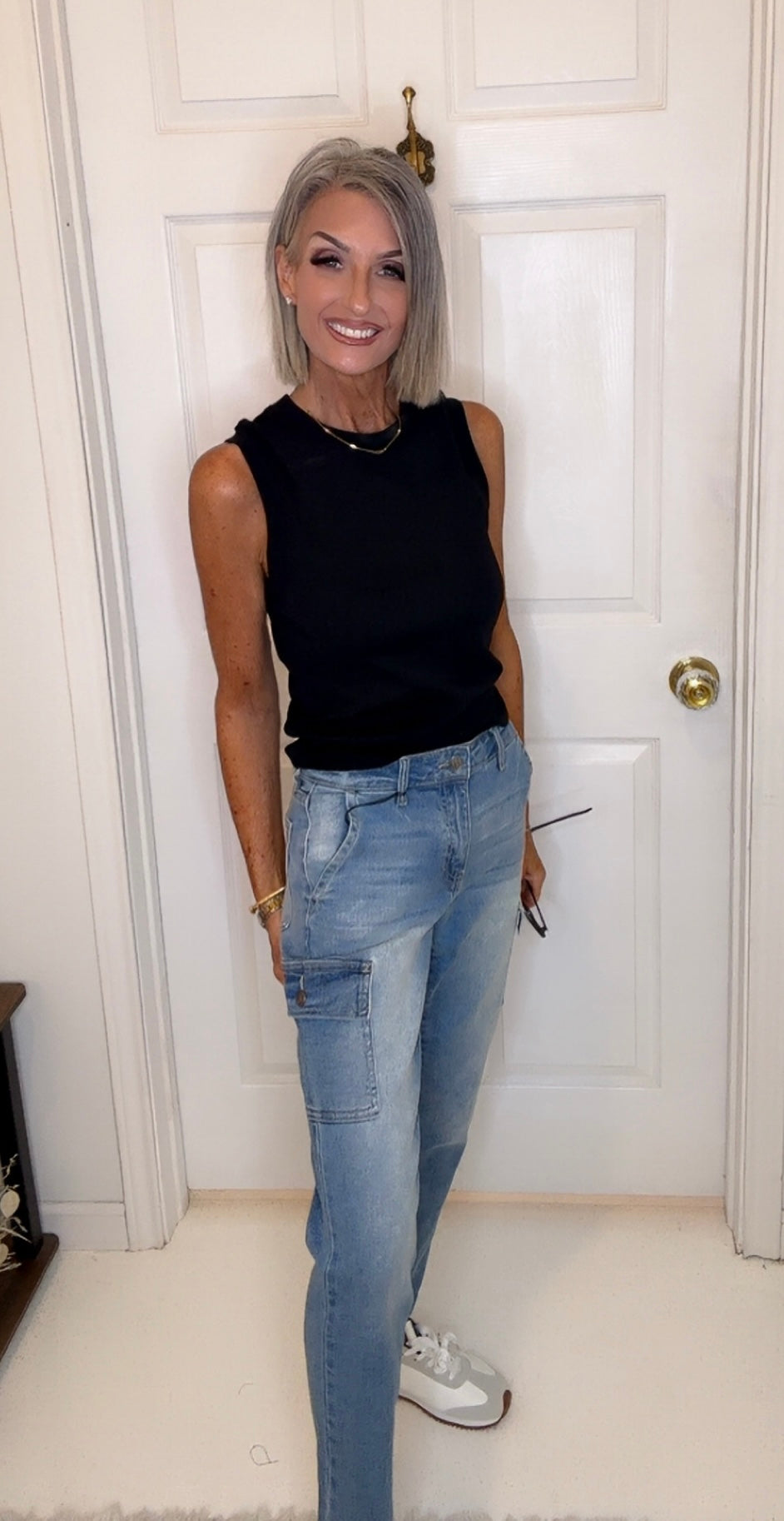 These denim cargo straight jeans blend the rugged utility of cargo pants with the timeless appeal of denim. They feature spacious cargo pockets on the sides, adding a functional and stylish element to the design.
