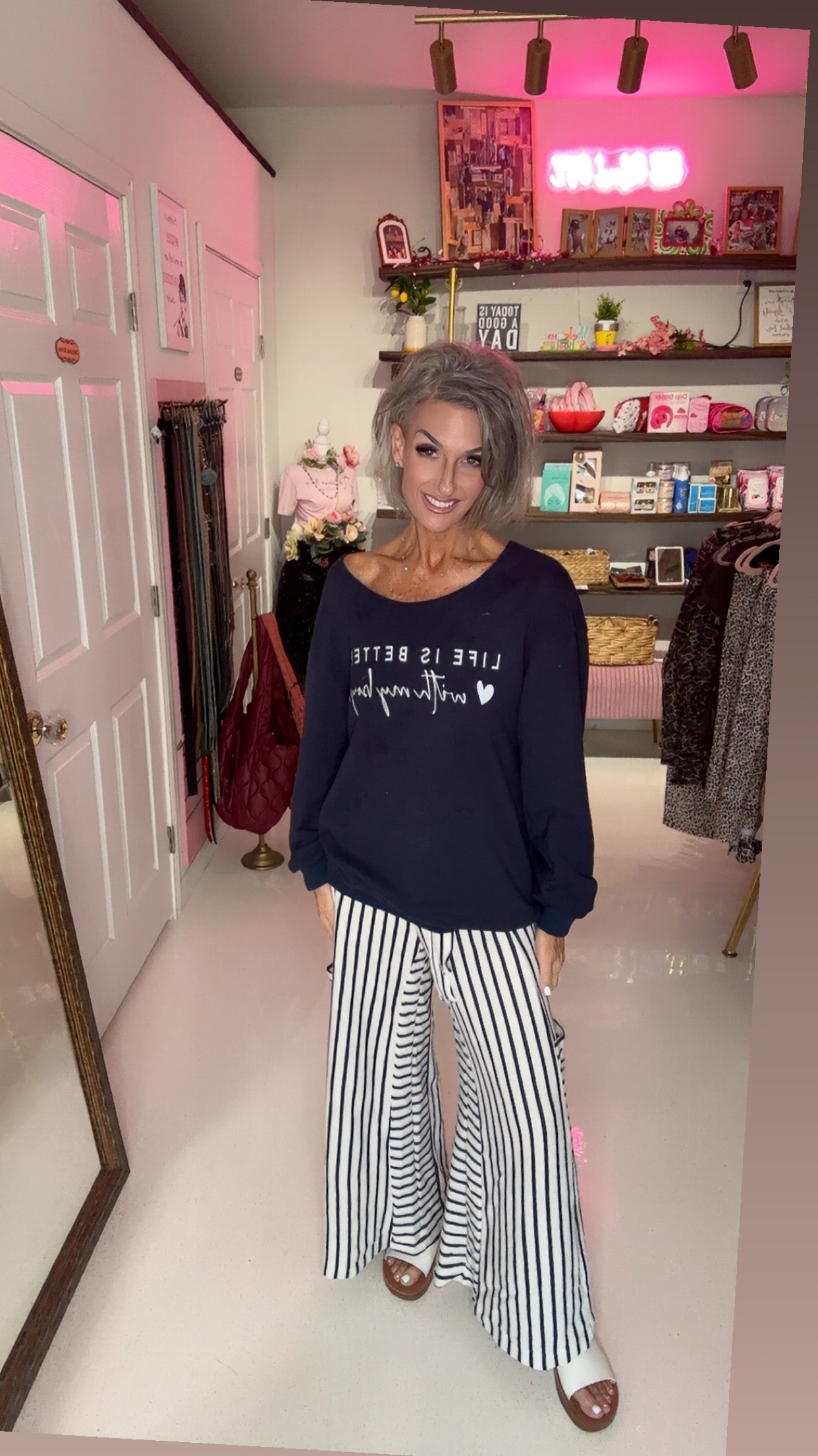STRIPE WIDE LEG PANTS -2 Side pockets -Elastic waistband -Relaxed fit -Wide leg -Stripe pattern MADE IN MEXICO -FABRIC 71%POLY27%COTTON2%SPANDEx